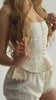 The Amandine shorts feature cream embroidery on a soft white base. The intricate bloomer shorts are crafted with a side button detailing, a V shaped front basque waistline and tiers of lace trim along the bottom hem. The back of the shorts are elasticated and feature a drawstring ribbon for adjustability.