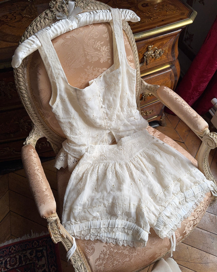 The Amandine top features an embroidered cream bodice with functional front button detailing. The curved waistline accentuates the hand applied crochet-style lace at either hip. Layers of textural intricacy comprise the body of this piece and make it the perfect top for any pairing. Top and shorts are fully lined in 100% cotton.