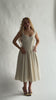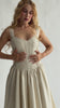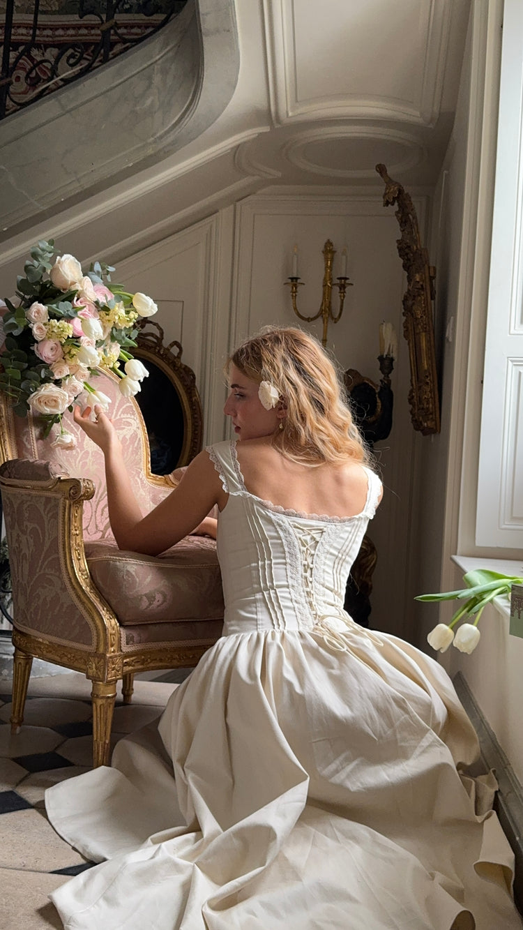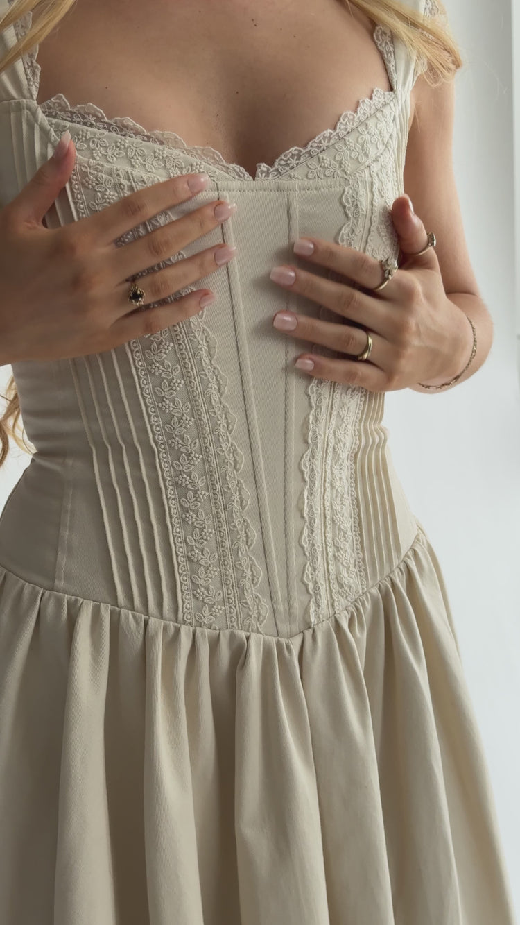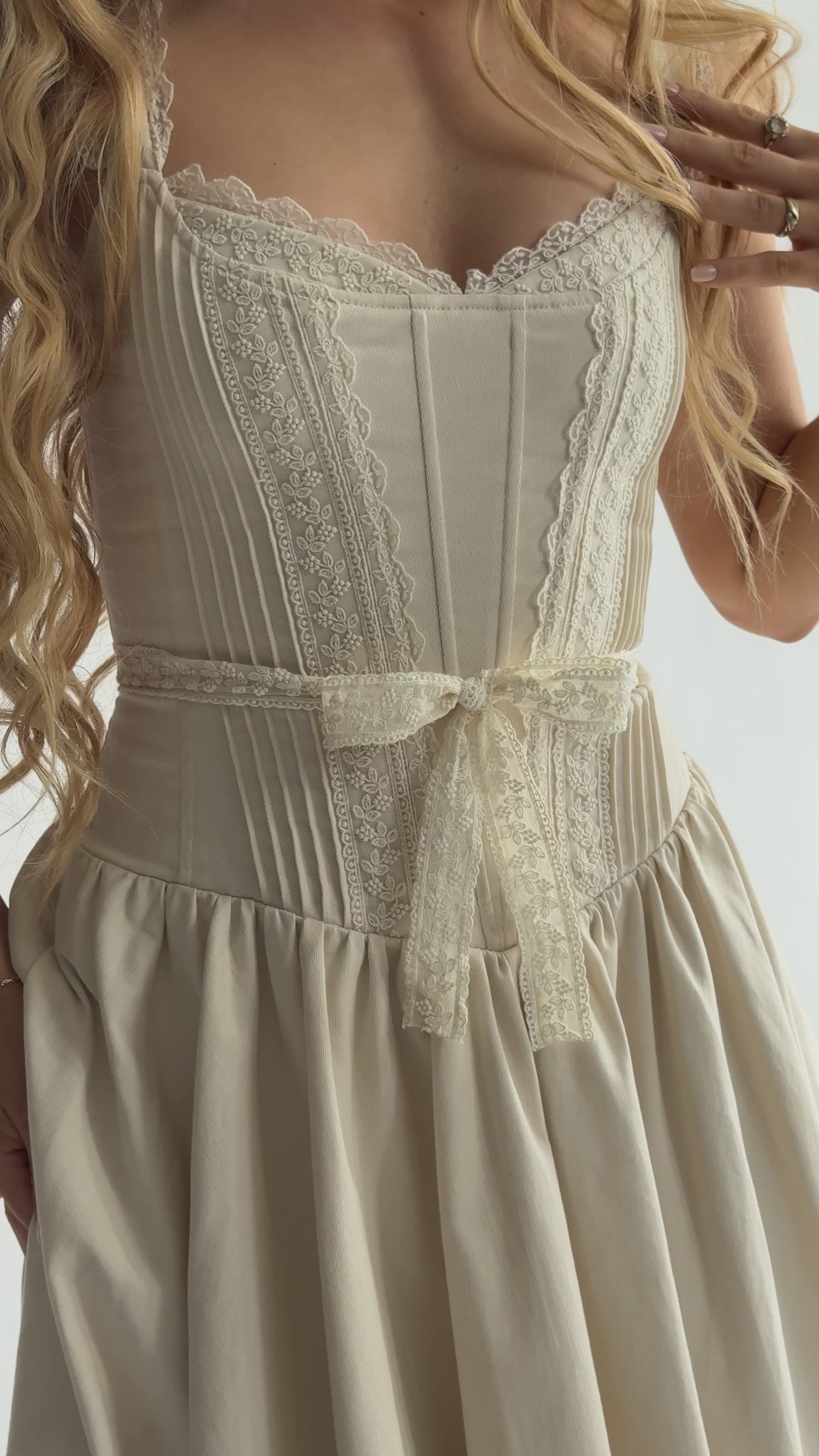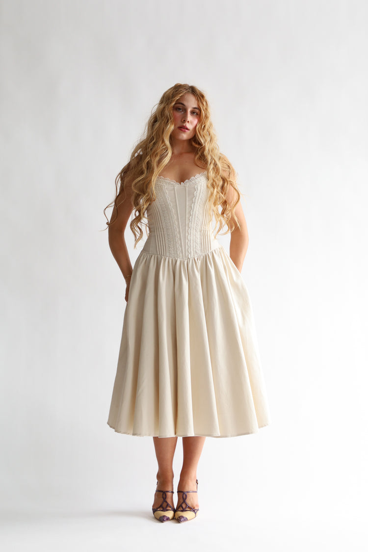 The Madeleine dress is crafted from cream colored stretch cotton that features an intricately adorned lace-trimmed bodice, with ivory lace along the boning on the front of the bodice and trimming the neckline. The gathered skirt in cream cotton is a midi, allowing the most versatile length. The straps also trimmed in lace match the corset back which allows for some adjustability. The pintucks and romantic neckline add intricacy to this piece, while the lace belt can be worn to accentuate the waistline.-Colour: cream
