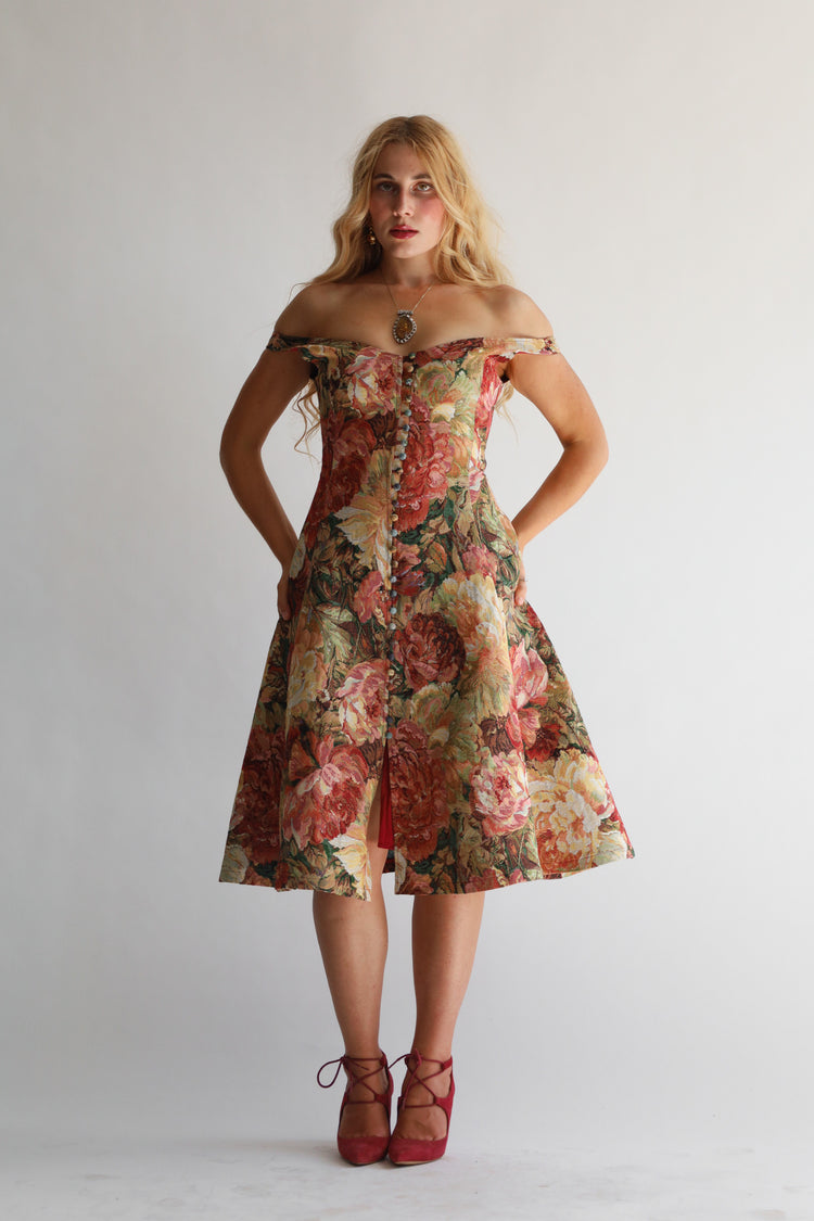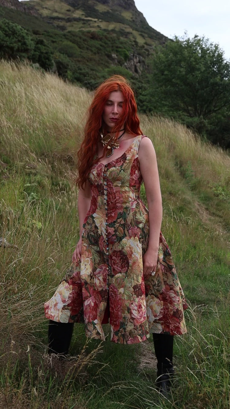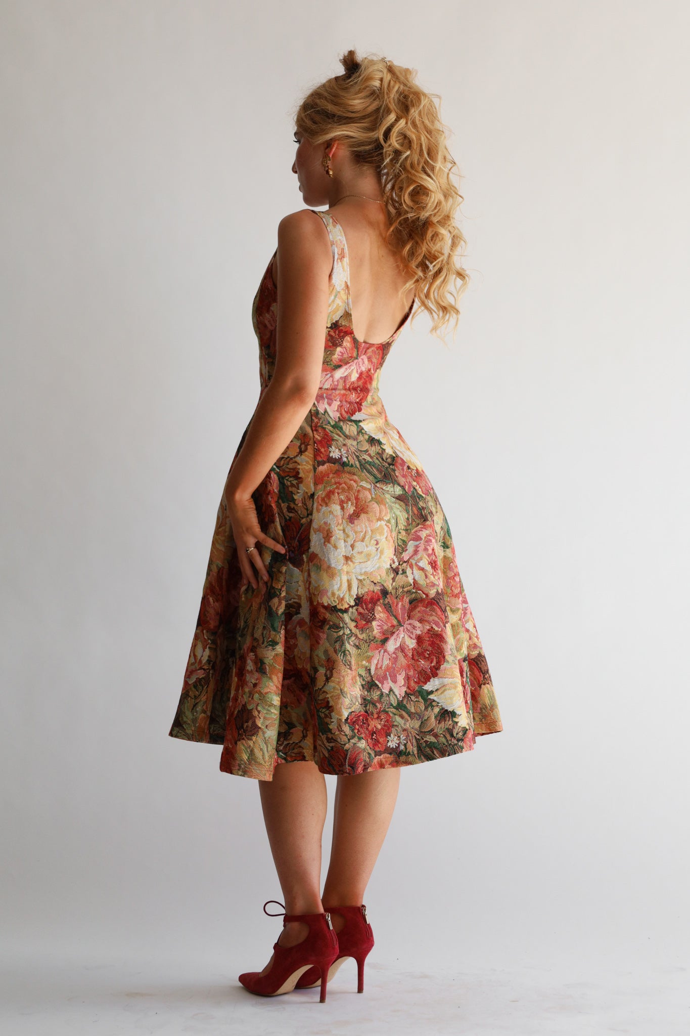 The Juliette dress is a midi length dress crafted from embroidered cotton, cut on the princess seam for the most flattering fit. The floral pattern of the fabric evokes an oil painting of a still life and is created by embroidery creating a tapestry-like effect, rather than by dyeing/printing the print onto the fabric.