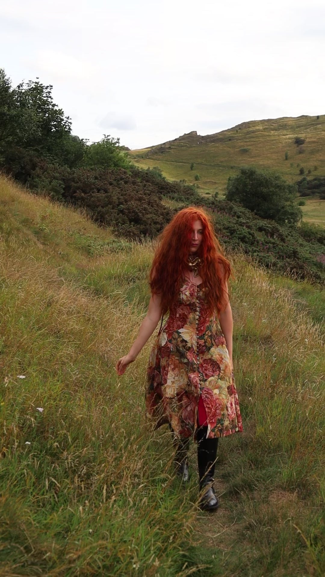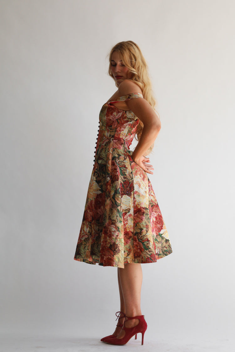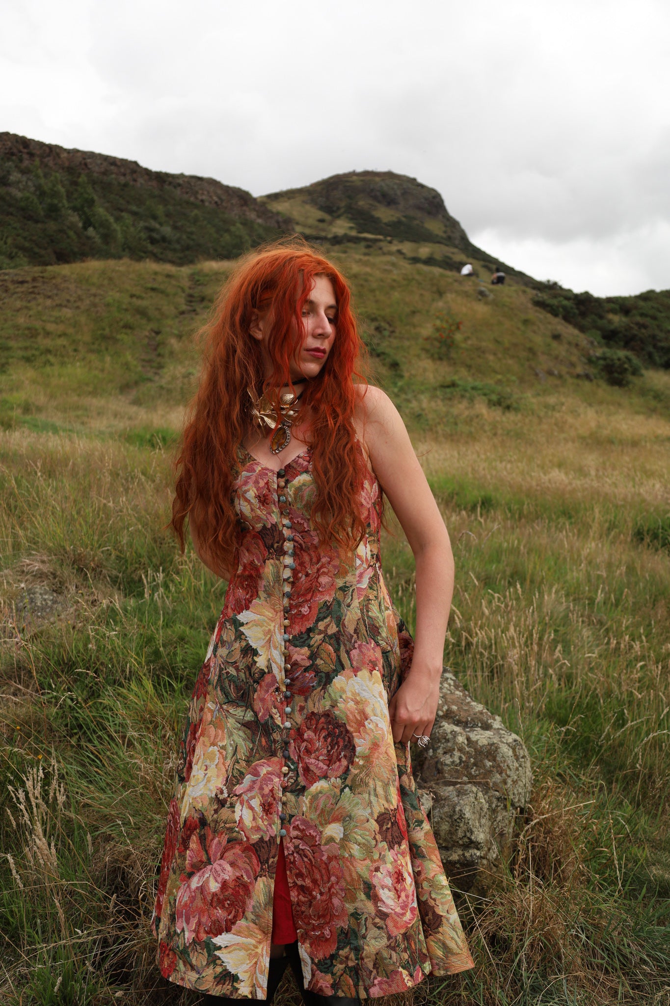 The Juliette dress is a midi length dress crafted from embroidered cotton, cut on the princess seam for the most flattering fit. The floral pattern of the fabric evokes an oil painting of a still life and is created by embroidery creating a tapestry-like effect, rather than by dyeing/printing the print onto the fabric.