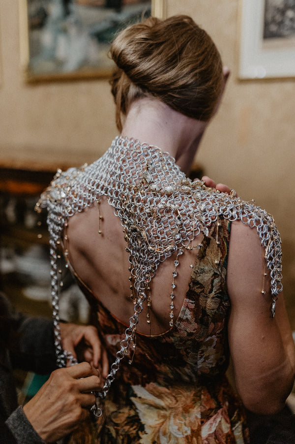 Châtelaines, antique keys and vintage chainmail purses adorn these looks, sourced for their wrought and weathered patina and styled as inédite necklaces and bracelets. Ribbons that embellish the waistlines of corseted and structured silhouettes bear the motif of the fleur-de-lys, as a nod to the designers’ Montréal home. This chapter presents pieces in shades of vermillion and kermes red, echoing the colors of medieval illuminures.