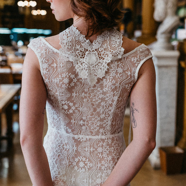 This chapter plays with opacities, juxtaposing a sheer lace-paneled motif like a crest in the center of the bodice, with embroidered cotton on either side. Bloomers and chemisettes and other cotton confections capture the essence of sonnets, often tender in their nature, and ephemeral in length. The collection closes with a floor-length white cotton gown, crafted in tiers and featuring an empty back and window pane bodice, epitomizing this collection’s romantic soul as a reflection of the brand’s house codes.