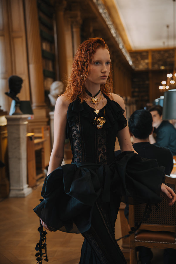 The first chapter, which is an homage to gothic literature, explores dark beguiling silhouettes with reinvented haunting Victorian detailing through black novelty lace, transparencies presented alongside black tulle accents which provide depth and texture to this chapter. Certain looks feature sirenesque silhouettes, with body-skimming lace panelling hemmed by black chiffon, and mini skirts that gain their volume from Victorian inspired bustles paired over narrow, floor length lace dresses. Other styles are crafted from black silk chiffon, whose diaphanous appearance mimics the translucent quality of peering at a figure underwater. This theme is carried into other looks from this chapter, including a floor-length black lace gown which is adorned by a tulle capelet, creating a silhouette inspired by Gustav Klimt’s haunting painting Mermaids. Taken altogether, this chapter is a gathering of designs that create the portrait of a coven, radiant with a sense of equal parts sisterhood and fortitude.