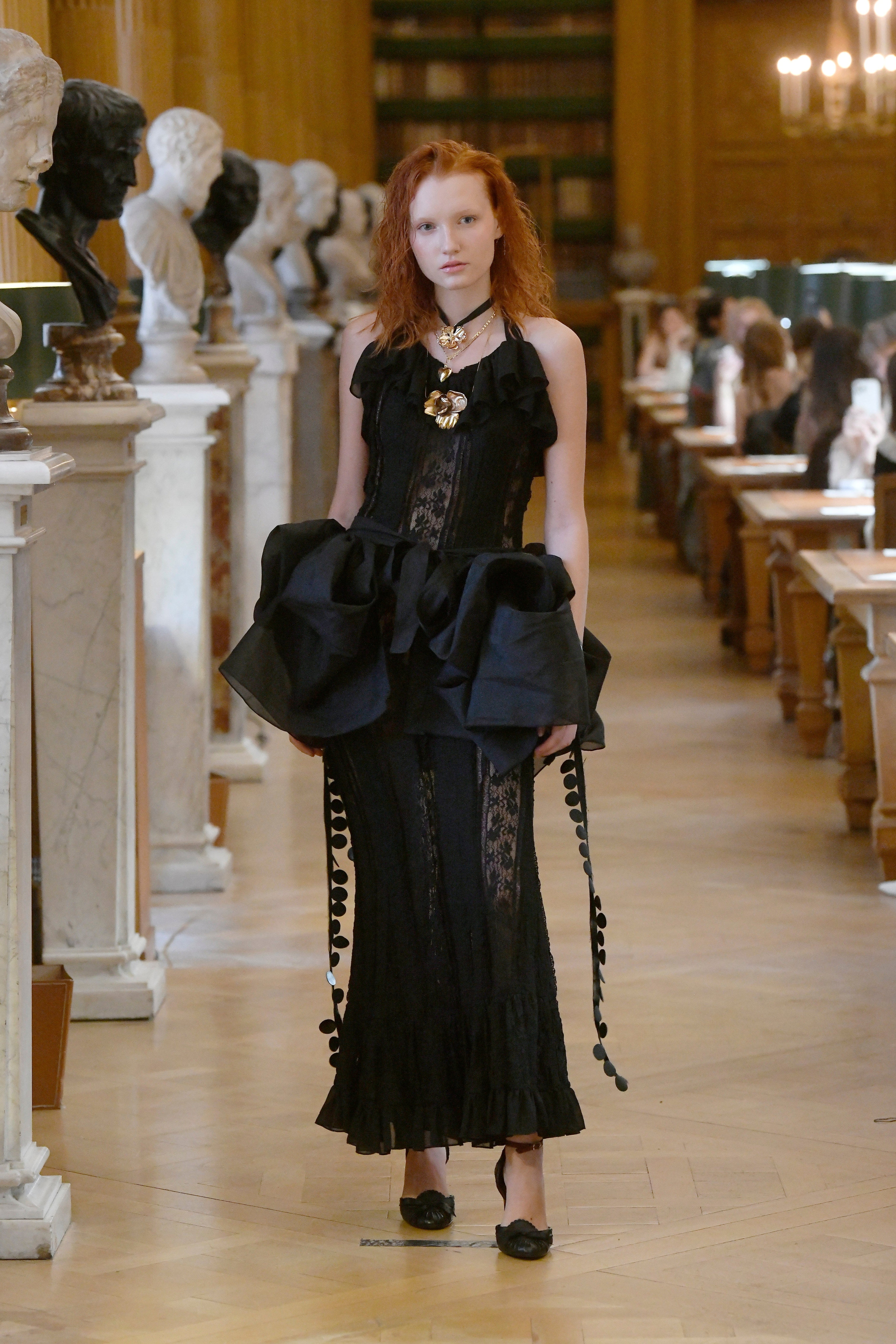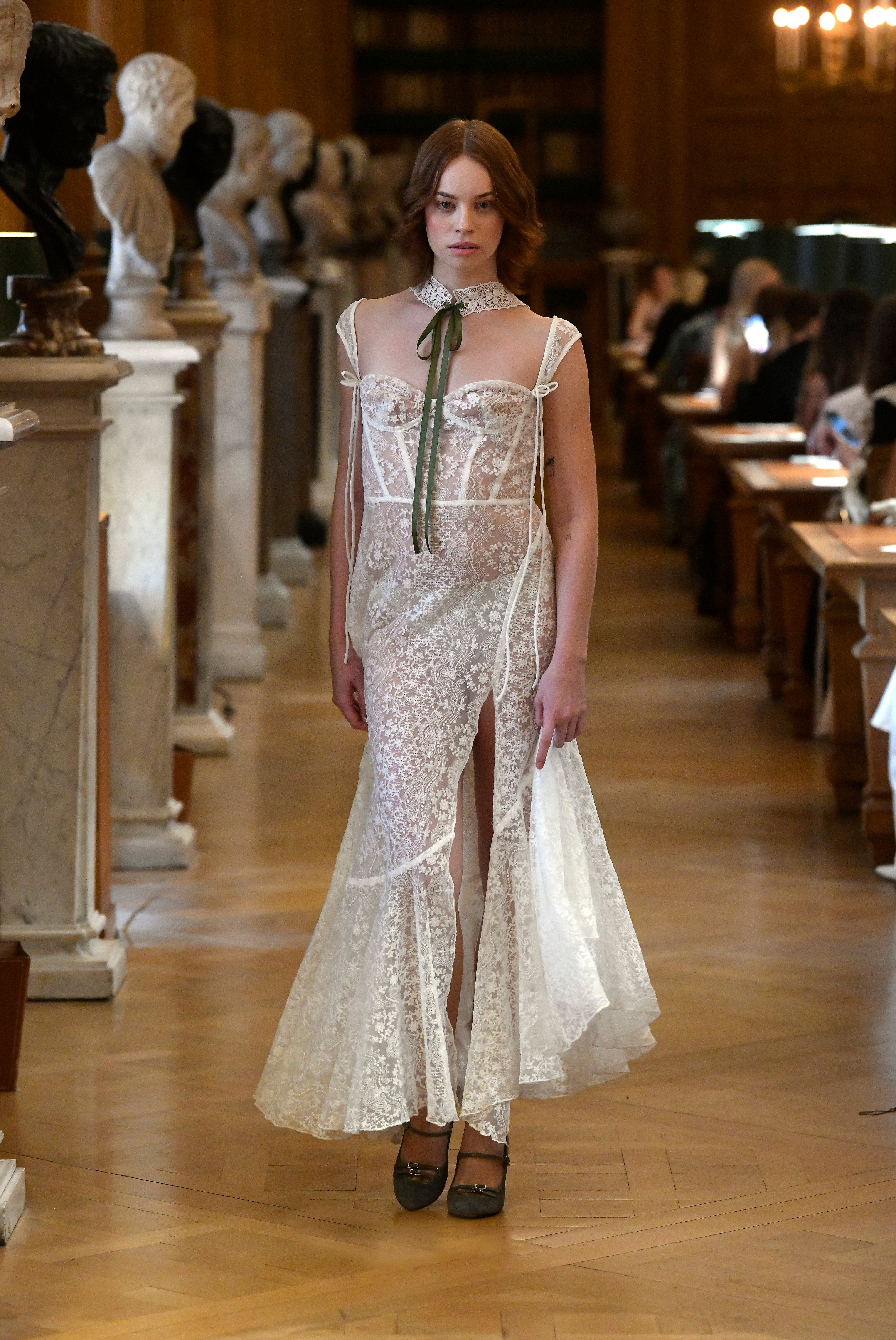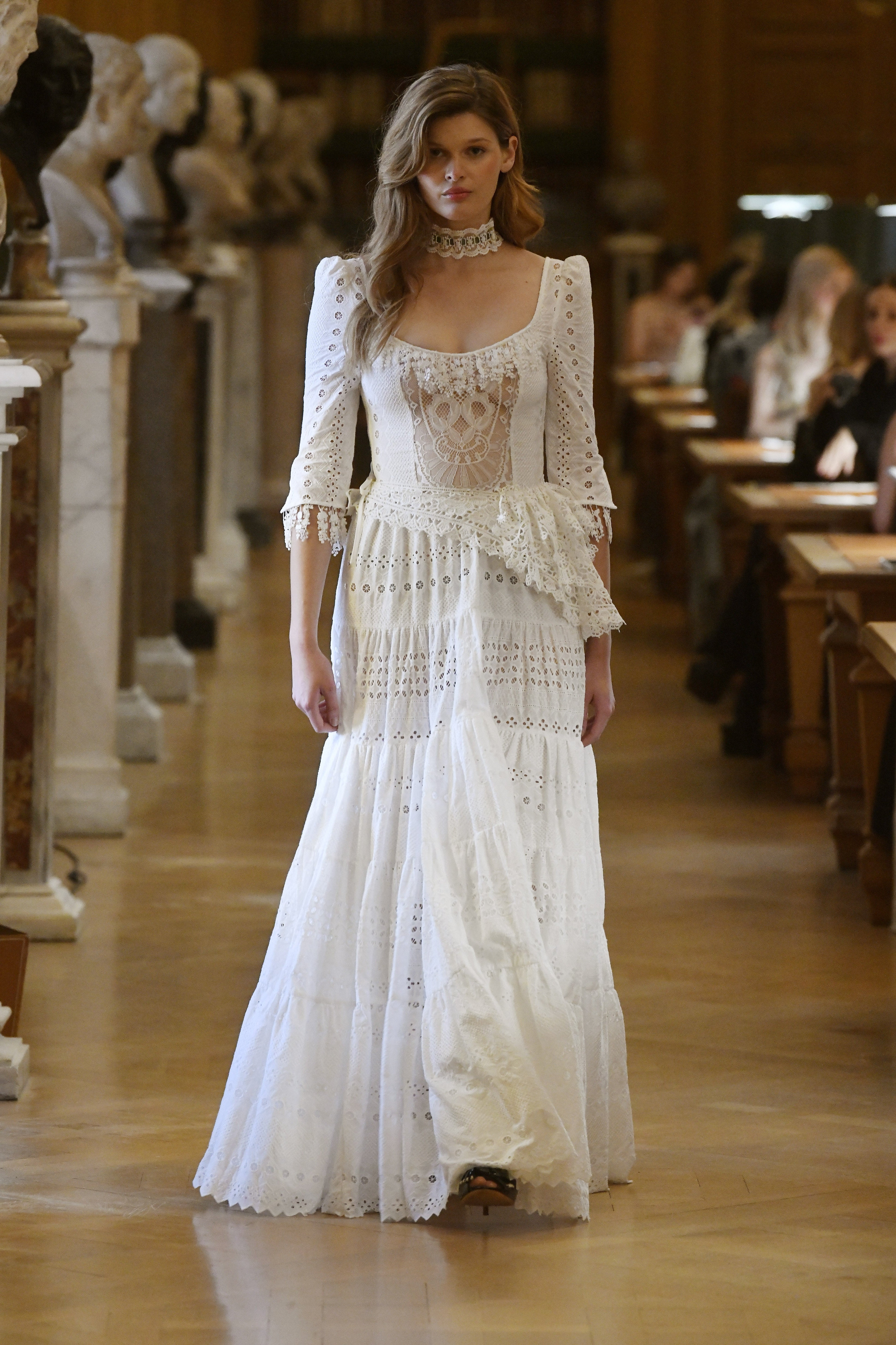This leads effortlessly into the third and final chapter, which is an ode to sonnets and poetry, coalescing Edwardian elements with soft sheer cottons and airy lace detailing. This segment tells the story of ethereal creatures, embodying the lilting prose they represent. Adorned in embroidered whites and creams, these designs feature guipure lace appliqués and broderie anglaise cotton. These silhouettes are adorned with antique Edwardian collars which, in parting from their canonical styling, are placed at the hips of dresses, or around the waistline, to create fin-like shapes that add volume and texture to the silhouette.