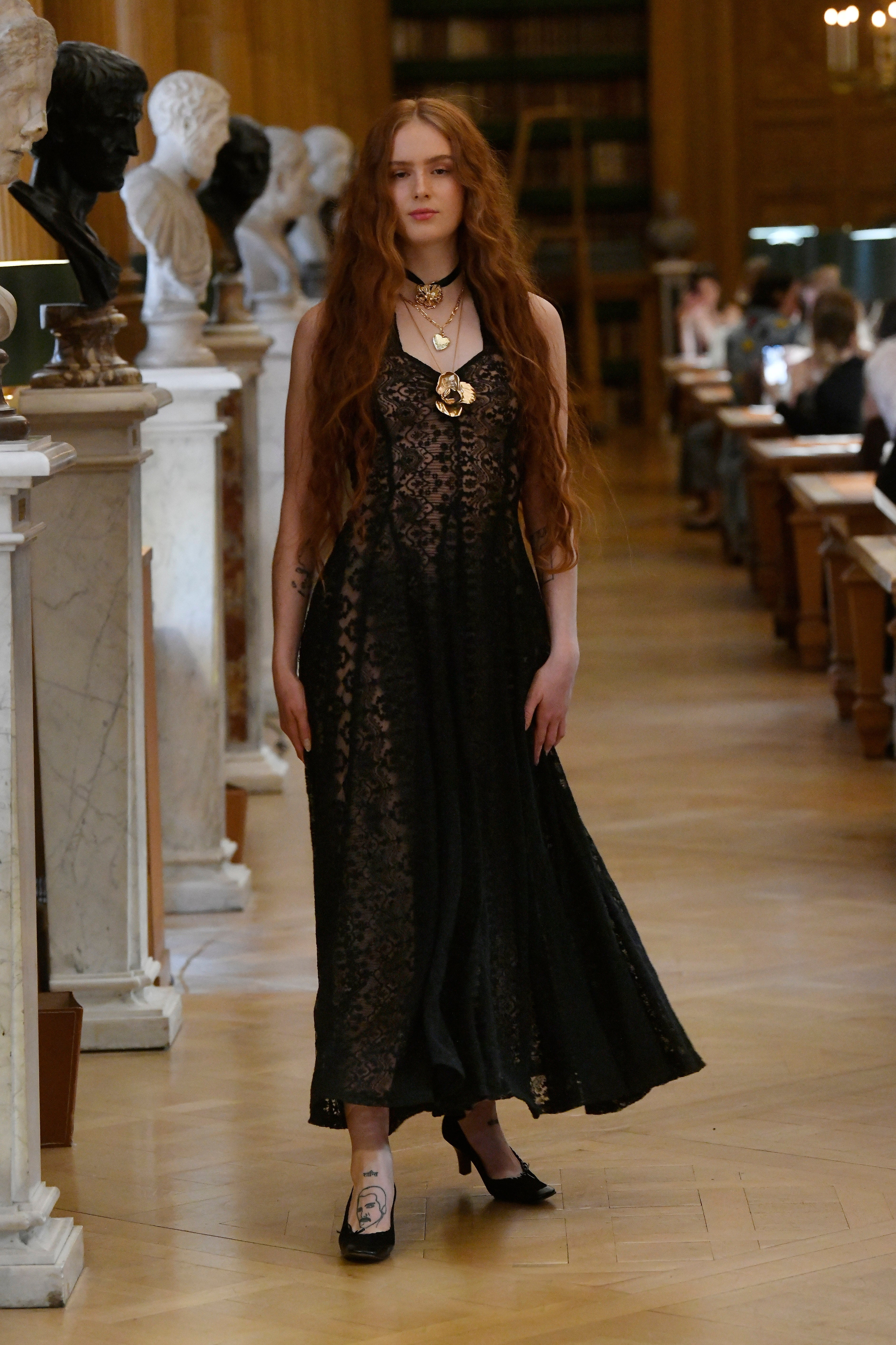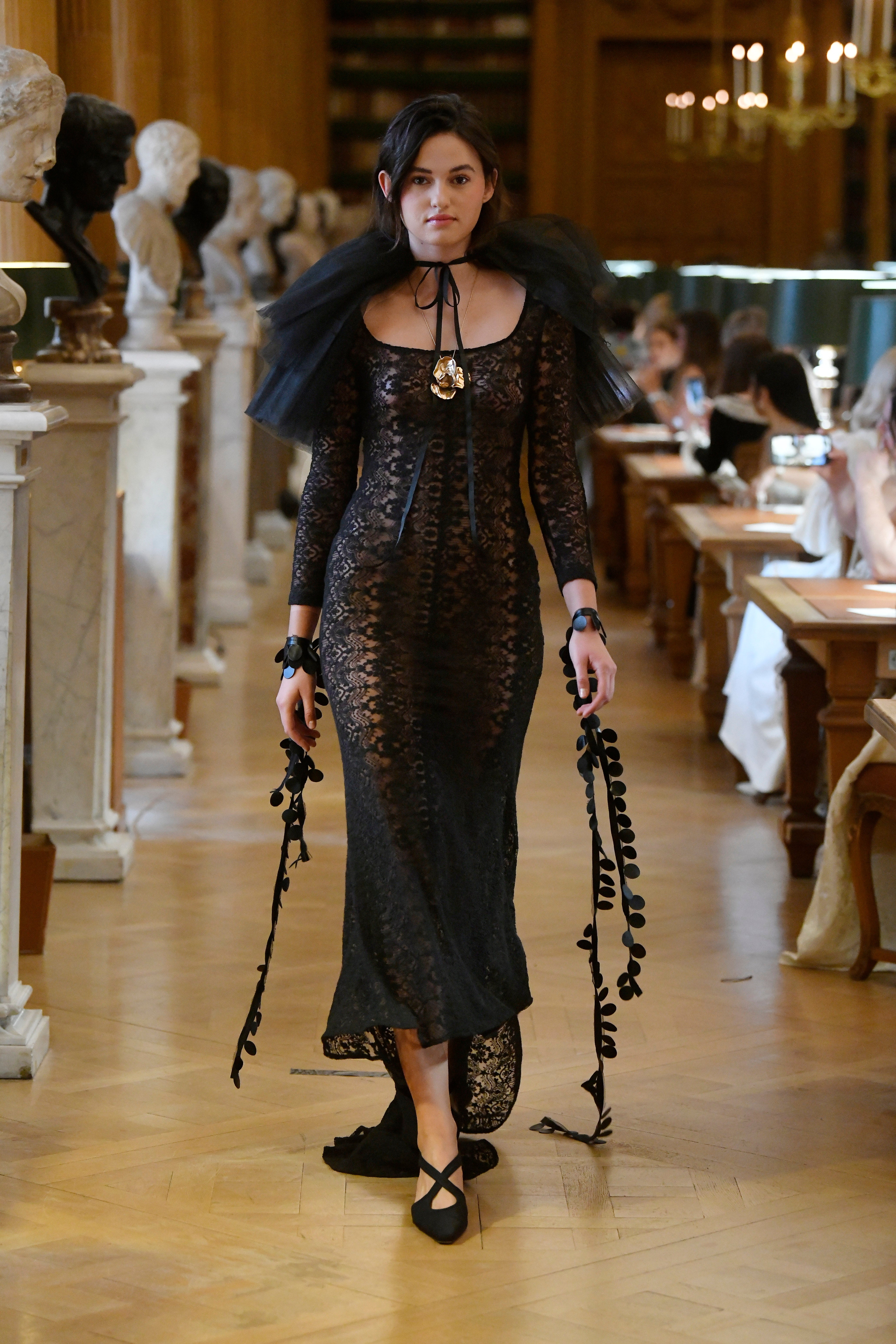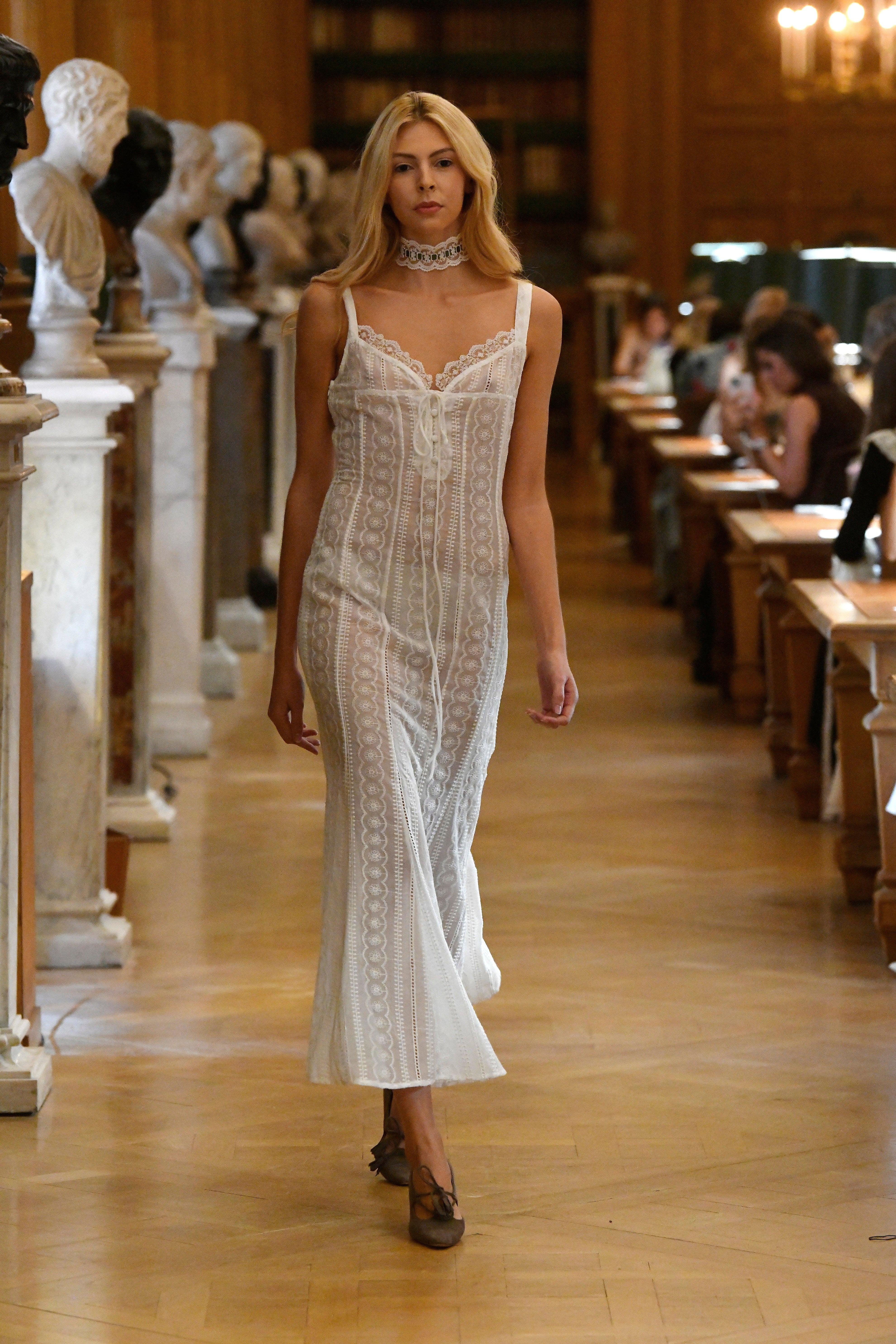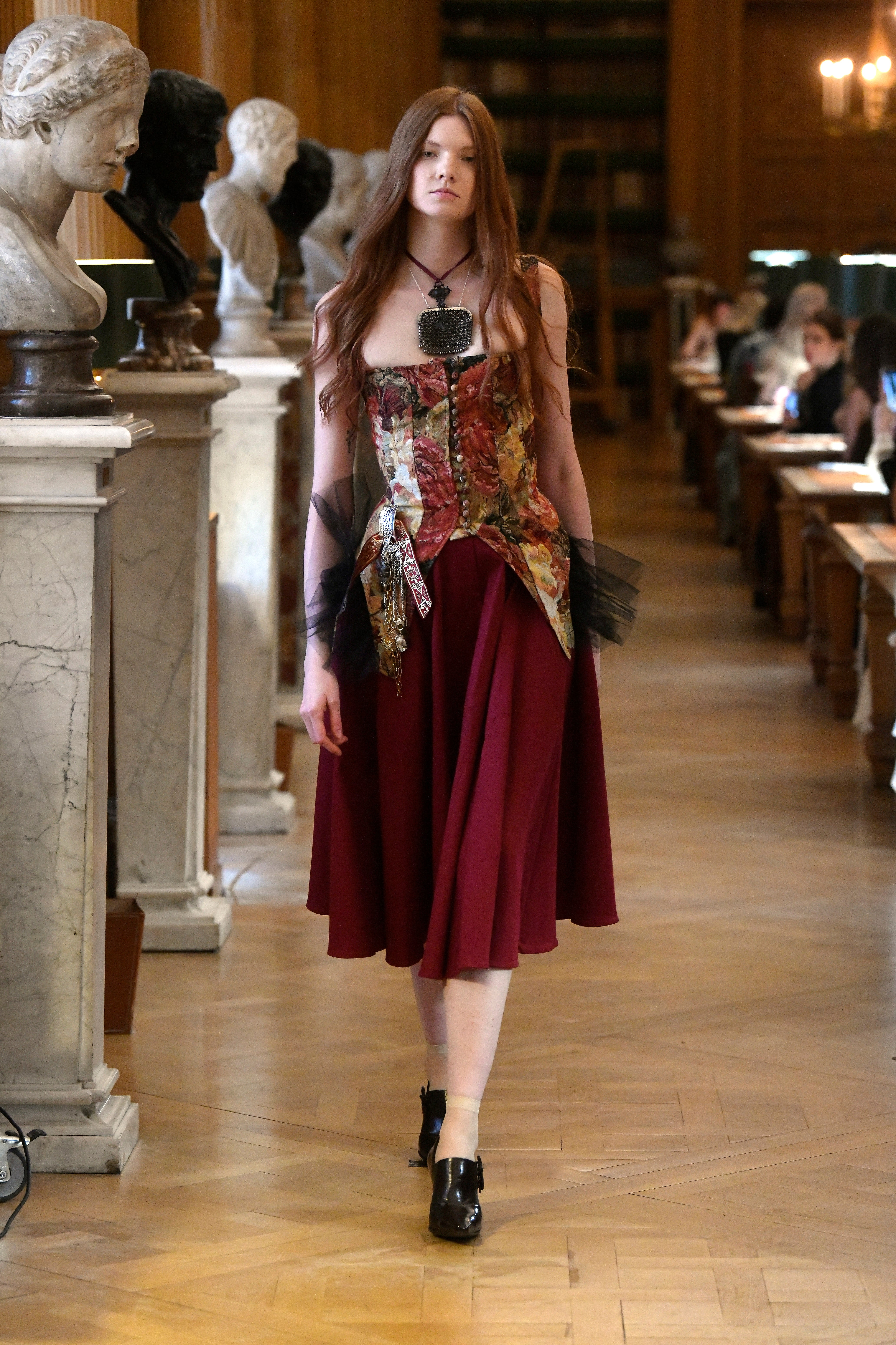 Selecting unexpected locations that are intimately tied to their collections’ themes has become a signature for the house, and this year’s show venue was no exception. The Wild Rose & Sparrow Spring Summer Prêt-à-Porter collection, inspired by the love of literature, was held in the Bibliothèque Mazarine, the oldest library in France in the heart of the famed Institut de France. This illustrious library is one of the gems of France’s cultural identity, and is a closely guarded treasure obscured from the public eye, making it all the more special that they accepted to open their doors to host this event and allowed the library to become, for a few short hours, part of the Wild Rose & Sparrow world. Guests were seated at the library’s reading tables, and, as the music started, models emerged from a secret door hidden behind a bookshelf in the main reading room.