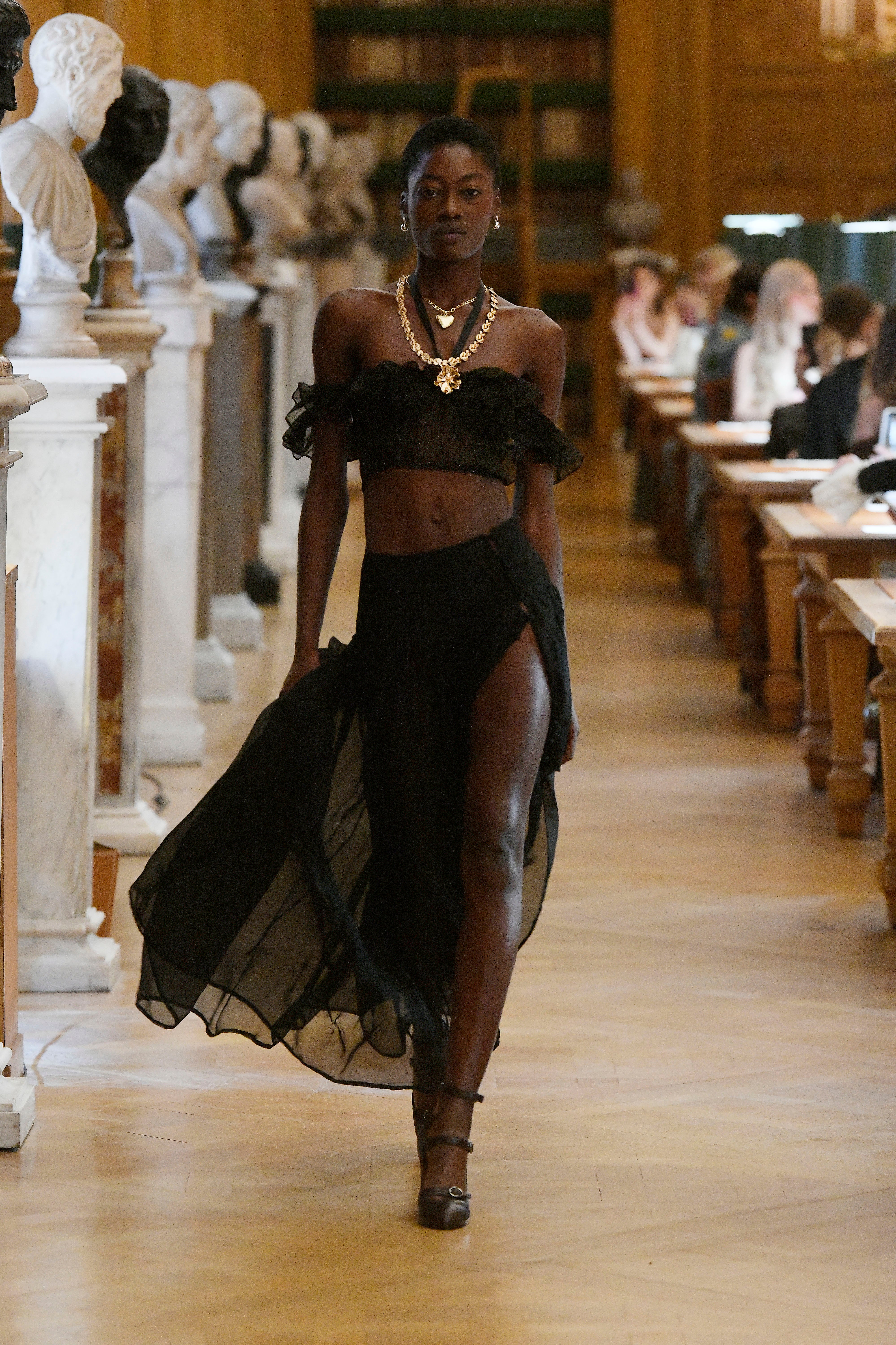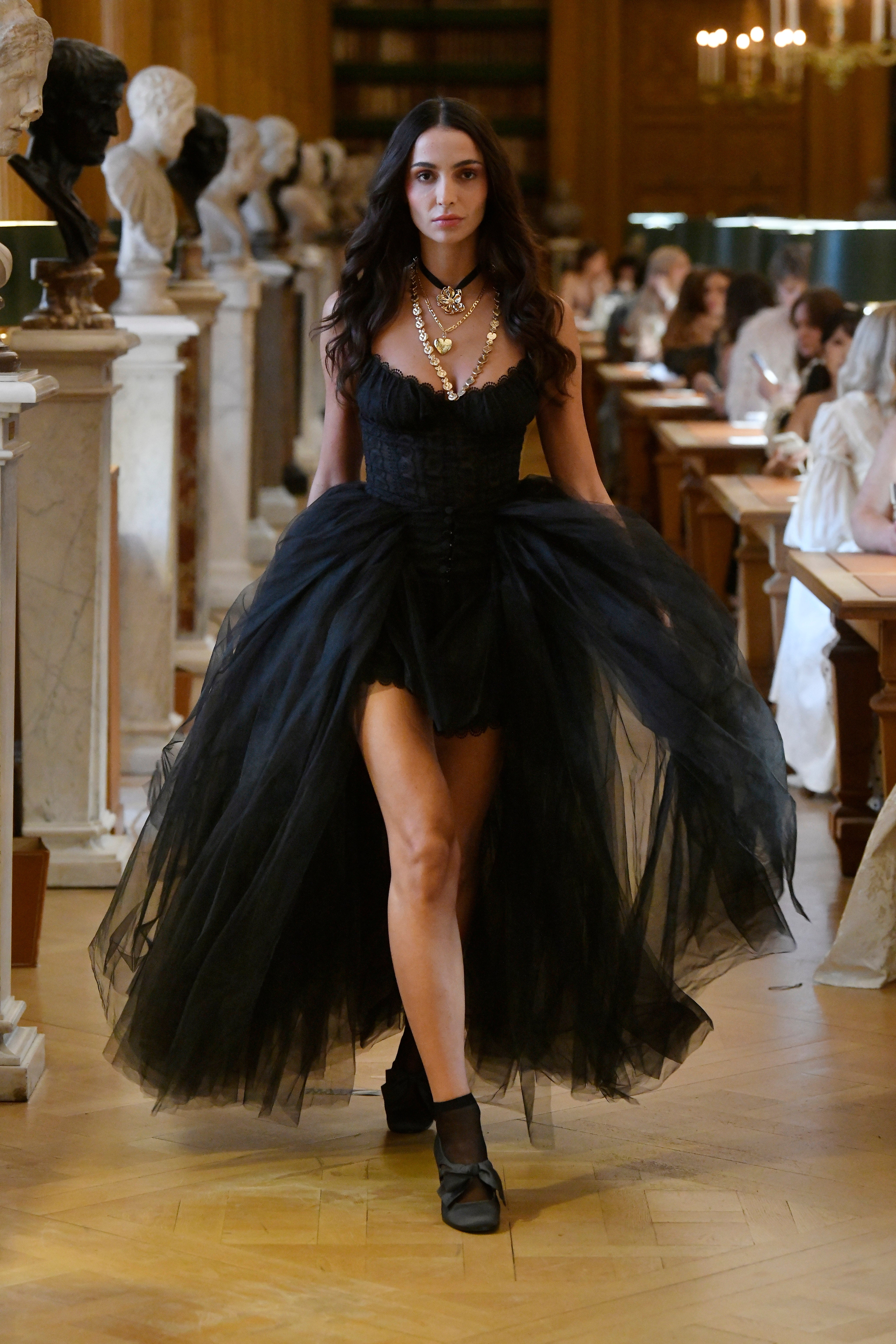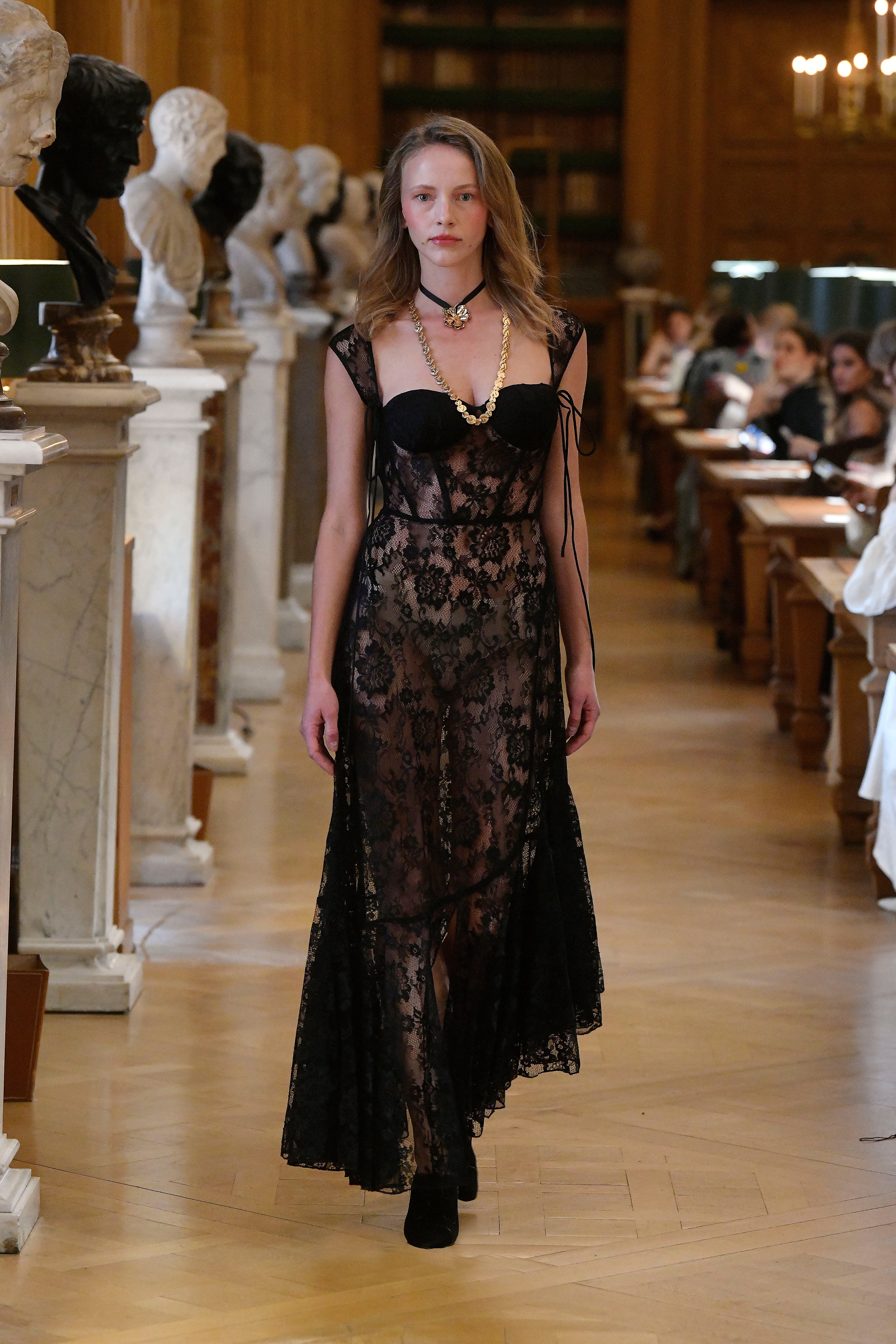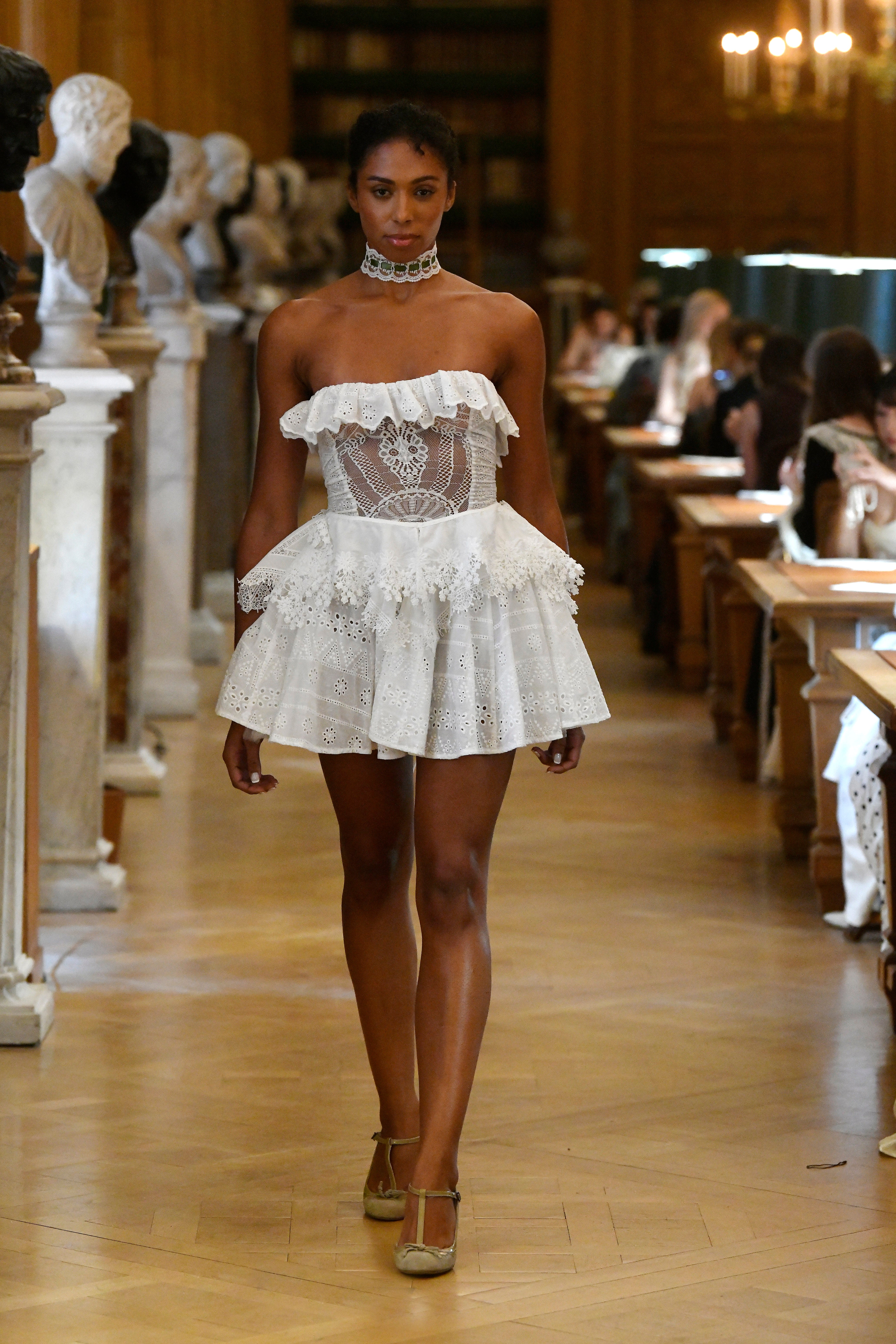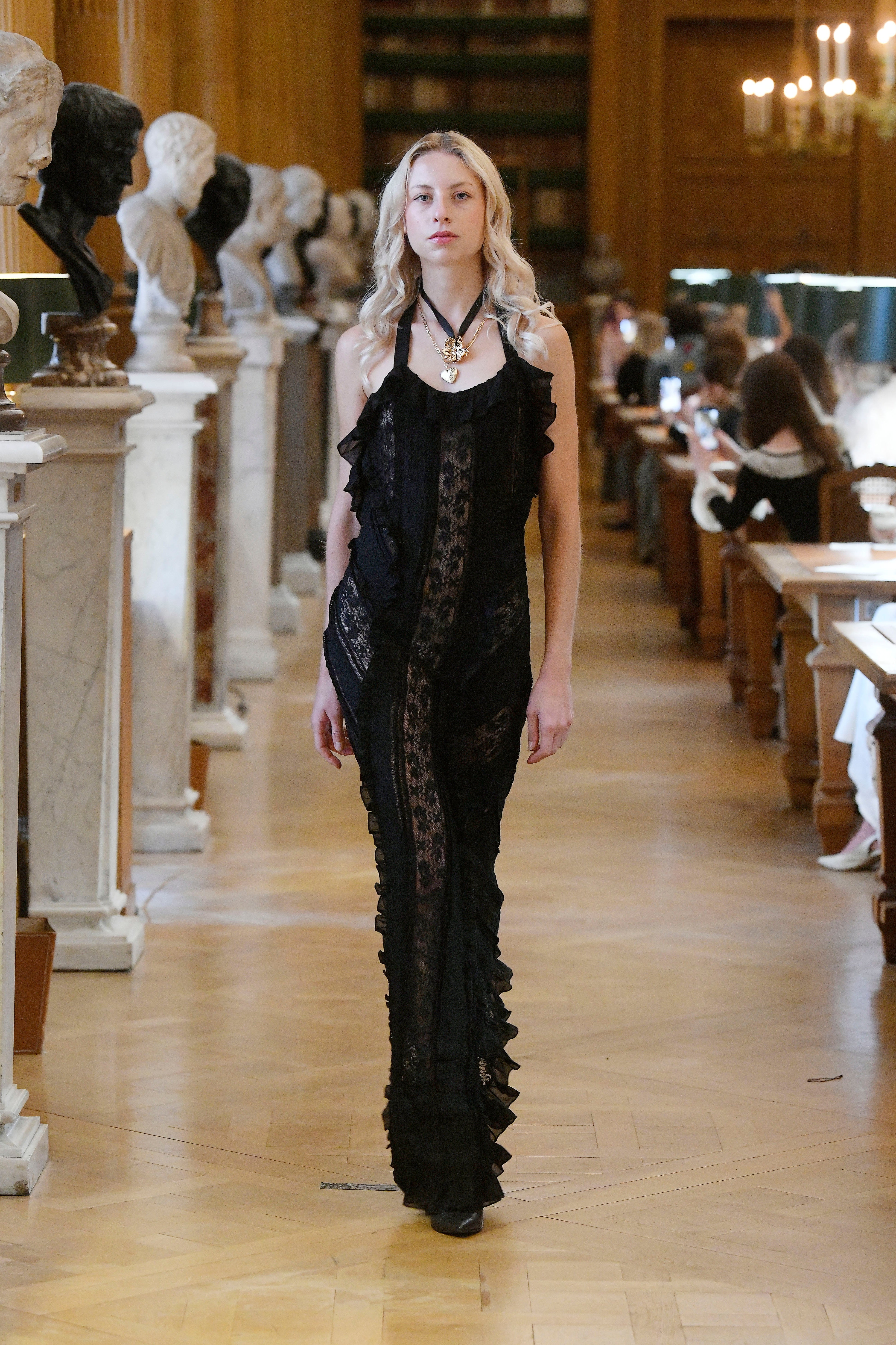 Selecting unexpected locations that are intimately tied to their collections’ themes has become a signature for the house, and this year’s show venue was no exception. The Wild Rose & Sparrow Spring Summer Prêt-à-Porter collection, inspired by the love of literature, was held in the Bibliothèque Mazarine, the oldest library in France in the heart of the famed Institut de France. This illustrious library is one of the gems of France’s cultural identity, and is a closely guarded treasure obscured from the public eye, making it all the more special that they accepted to open their doors to host this event and allowed the library to become, for a few short hours, part of the Wild Rose & Sparrow world. Guests were seated at the library’s reading tables, and, as the music started, models emerged from a secret door hidden behind a bookshelf in the main reading room.