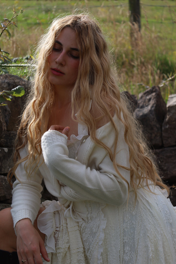 Le haut Austen est un délicat pull rose framboise qui présente une texture en tricot torsadé complexe et des détails en ruban ivoire tissés à la main le long de l'encolure et des poignets qui se terminent par un nœud fonctionnel, avec une encolure carrée douce d'inspiration Tudor.