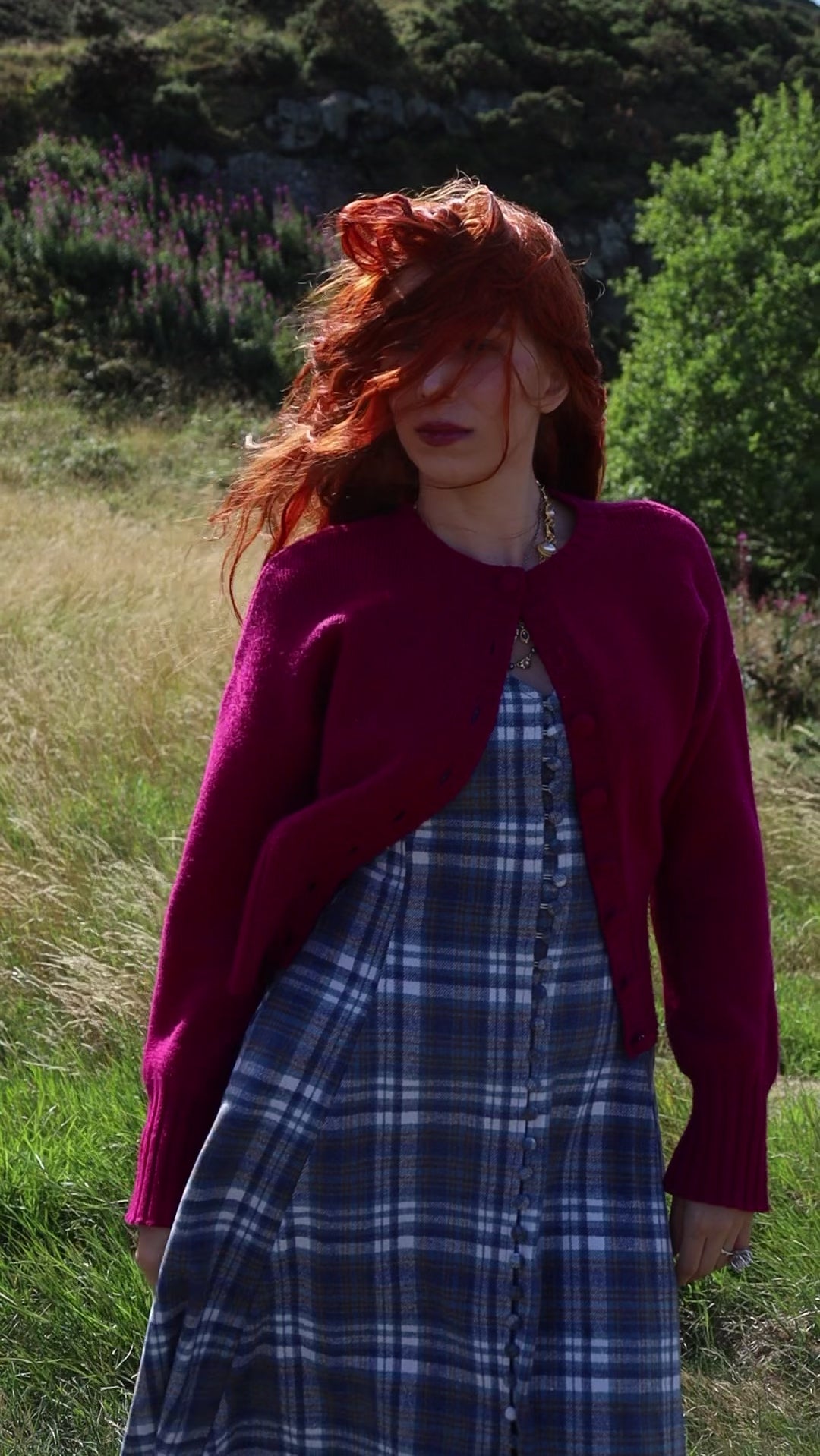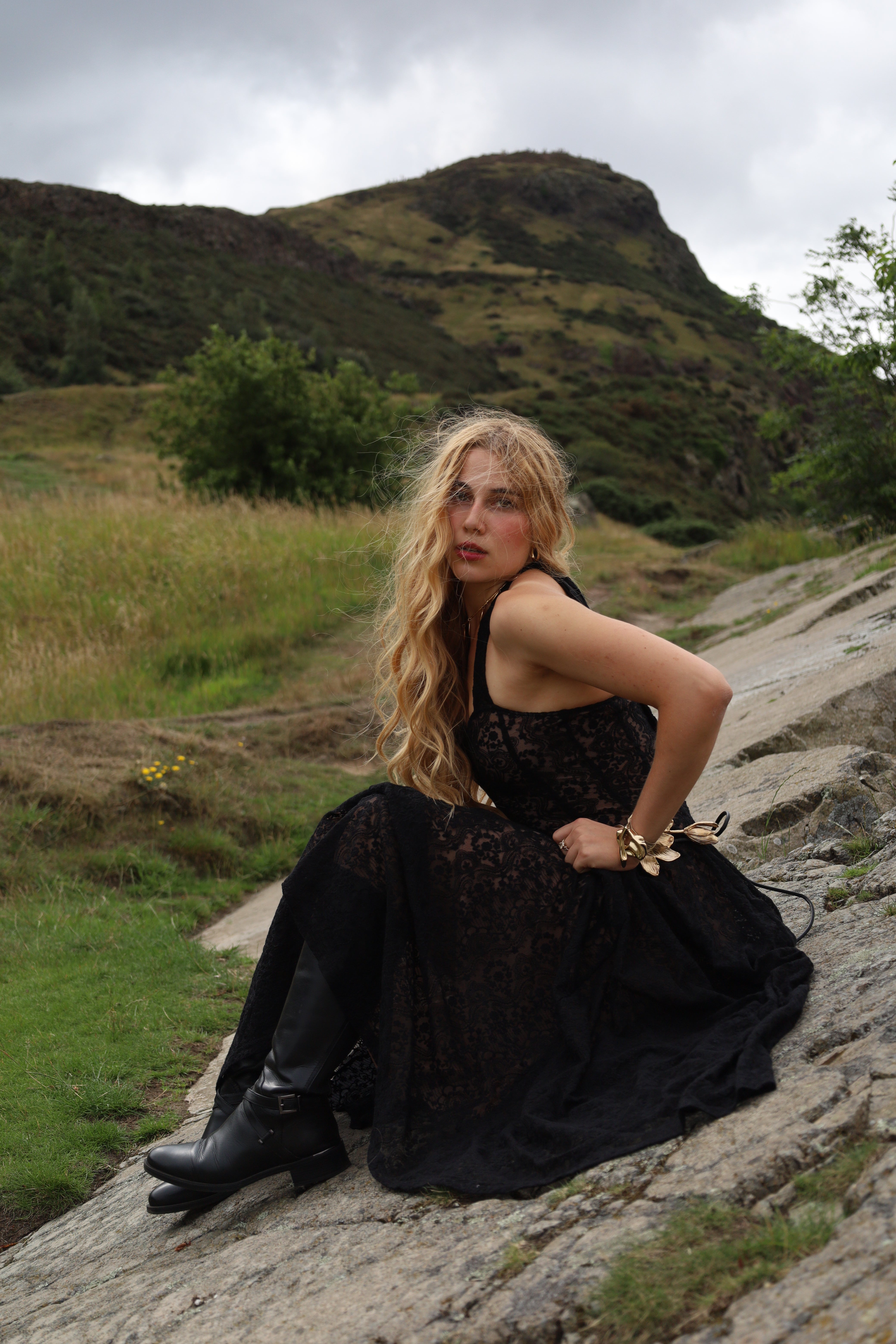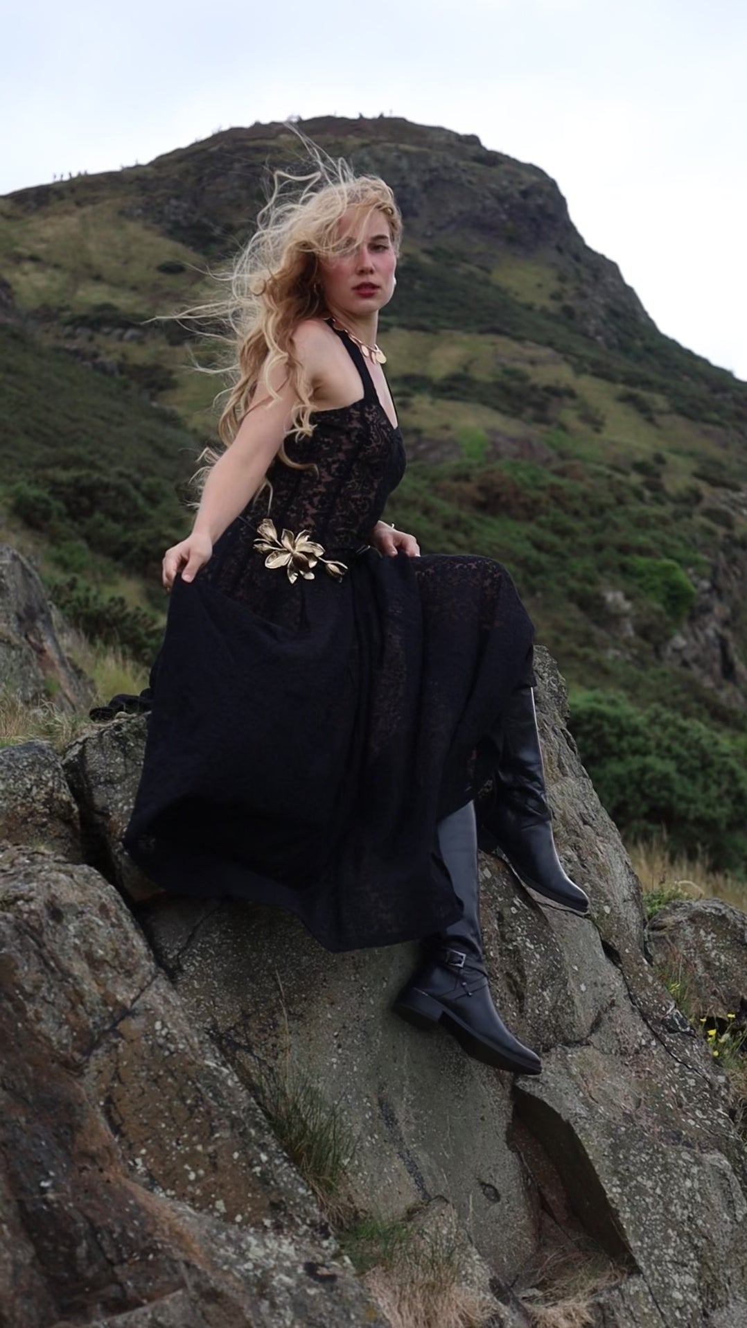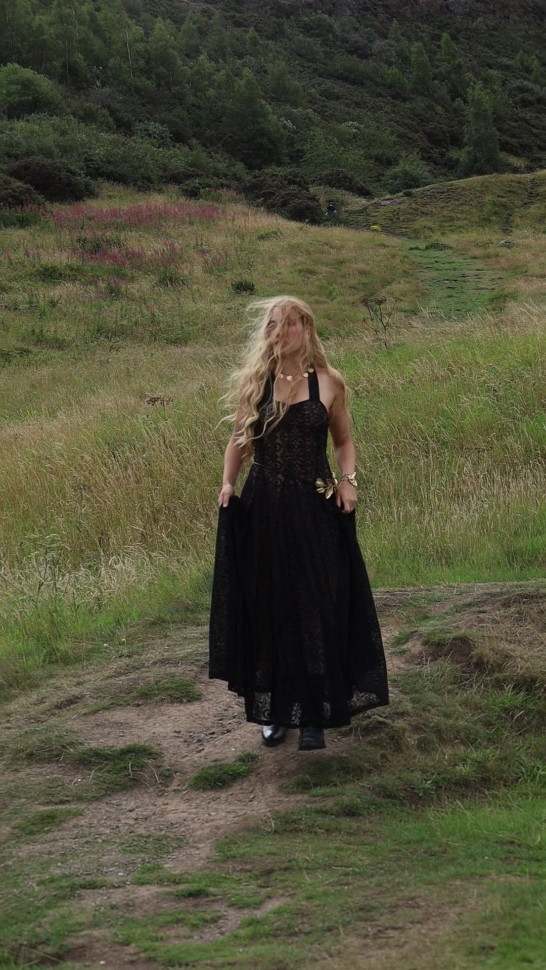 Inspired by the wild, desolate beauty of Scotland, this campaign was photographed in the Scottish Highlands. It is inspired by the silver-blue haze draped over the cliffside and the quiet blooming heartbeat of the landscape. Featuring plaid in wool blend, embroidered ember coloured florals, bestselling silhouettes now in black lace and more.