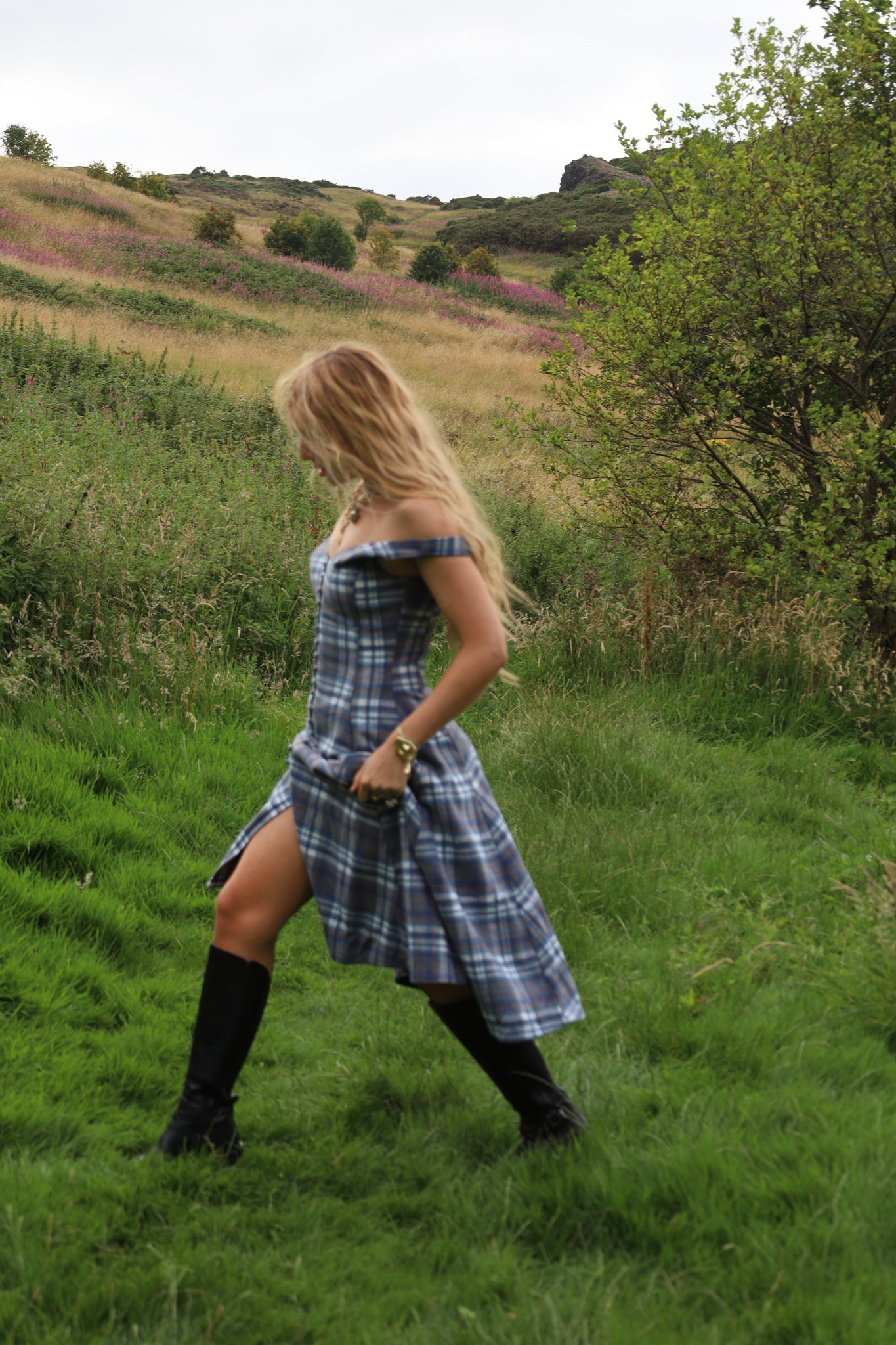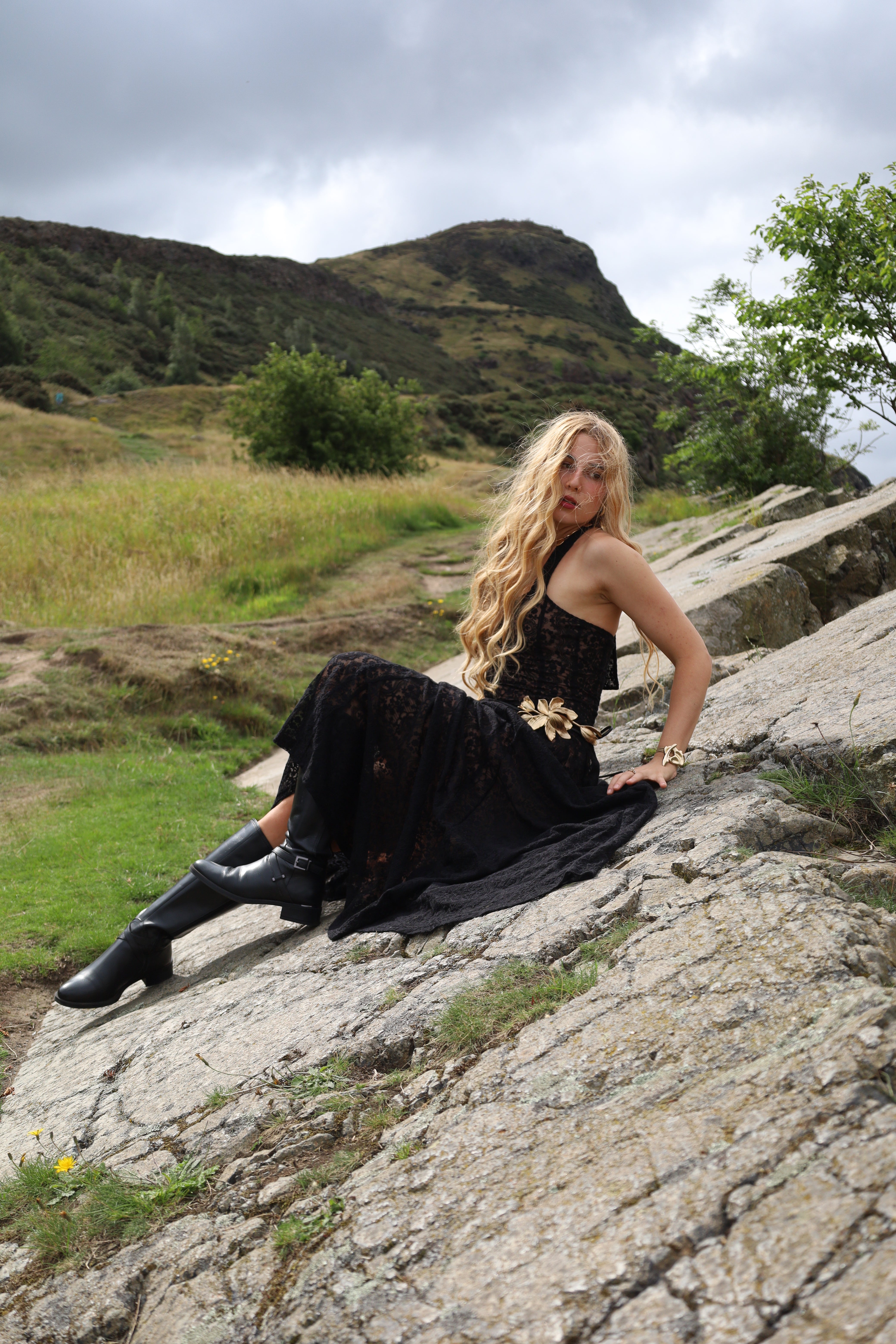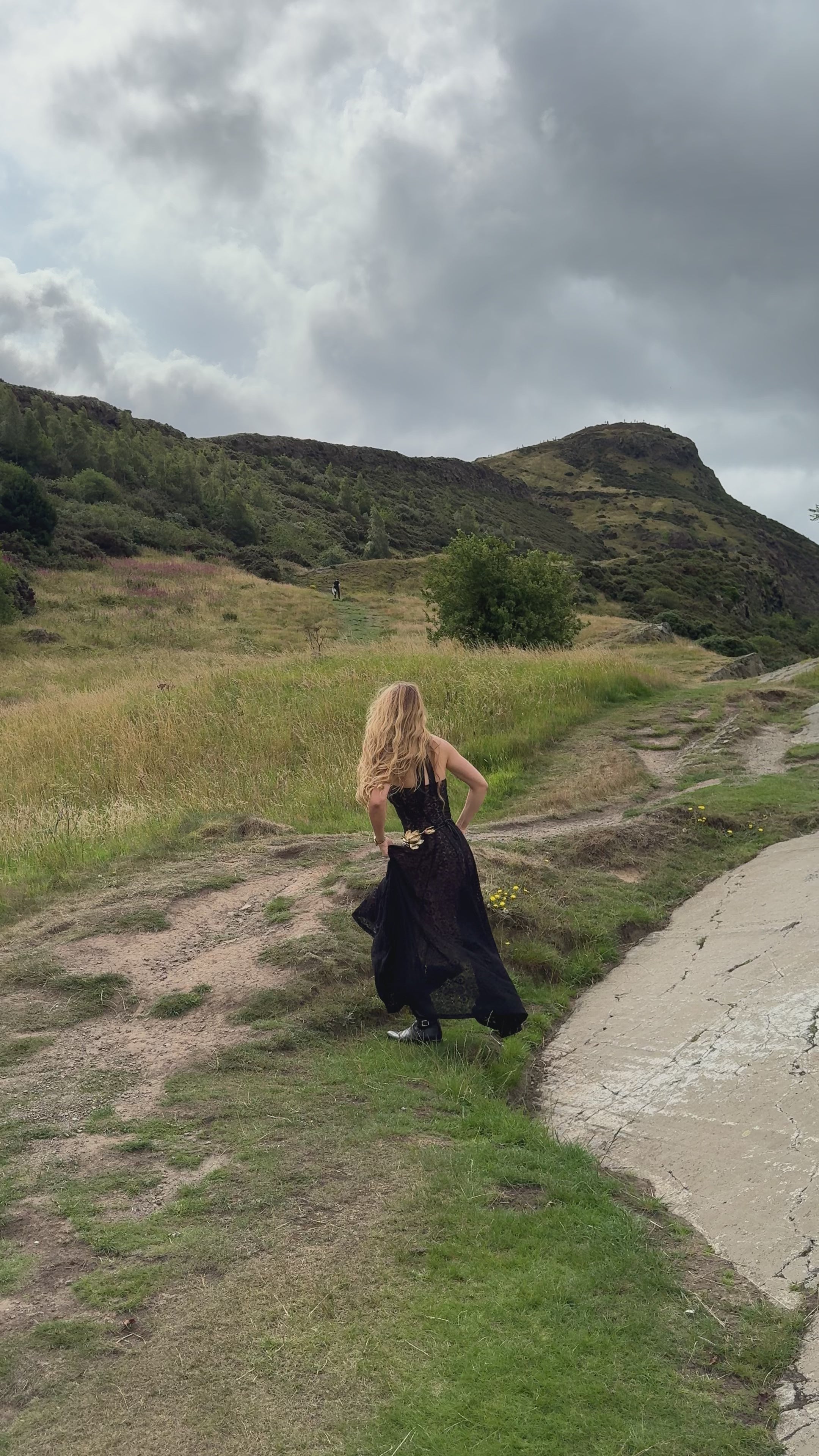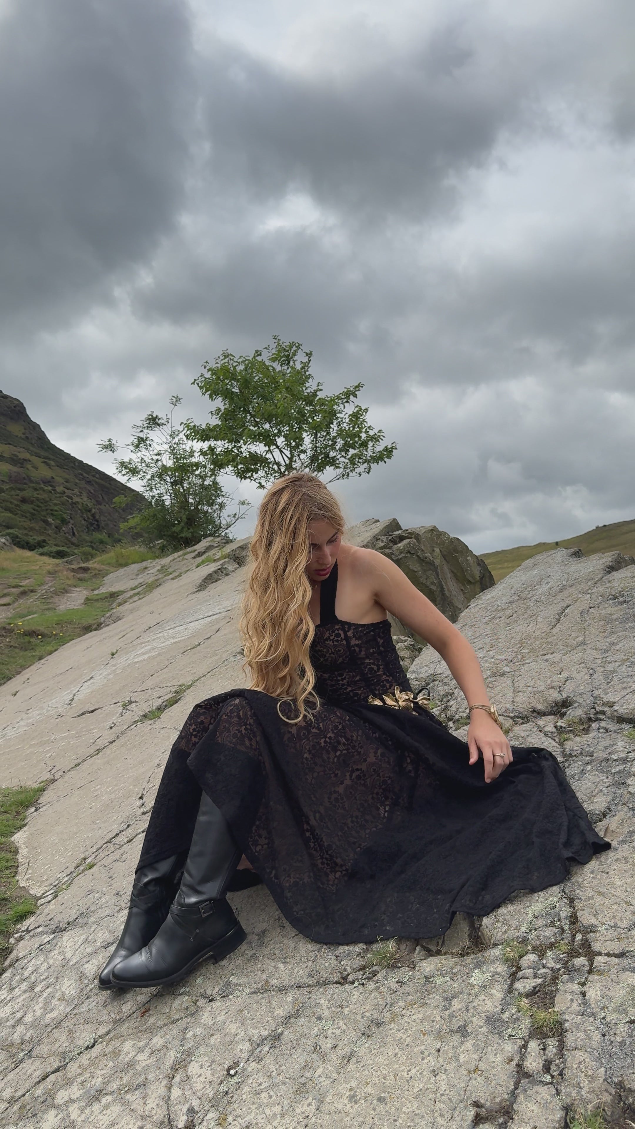 Inspired by the wild, desolate beauty of Scotland, this campaign was photographed in the Scottish Highlands. It is inspired by the silver-blue haze draped over the cliffside and the quiet blooming heartbeat of the landscape. Featuring plaid in wool blend, embroidered ember coloured florals, bestselling silhouettes now in black lace and more.